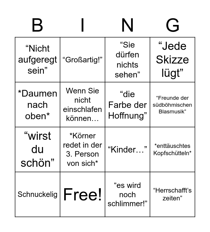 This bingo card has 21 words: Free!, “nicht wahr?”, “Großartig!”, “Früchtchen”, “es wird noch schlimmer!”, “die Farbe der Hoffnung”, “Nicht aufgeregt sein”, “Sie dürfen nichts sehen”, “Kinder…”, “Freunde der südböhmischen Blasmusik”, “wirst du schön”, “Jede Skizze lügt”, “Herrschafft’s zeiten”, Wir sind alle schlecht im Brüche addieren, Wenn Sie nicht einschlafen können…, Oida Voda, Schnuckelig, *Körner redet in der 3. Person von sich*, *Daumen nach oben*, *enttäuschtes Kopfschütteln* and *dirigiert uns*.