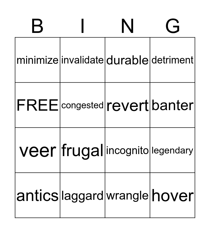This bingo card has a free space and 15 words: antics, hover, durable, minimize, banter, FREE, frugal, wrangle, congested, veer, legendary, detriment, revert, invalidate and laggard.