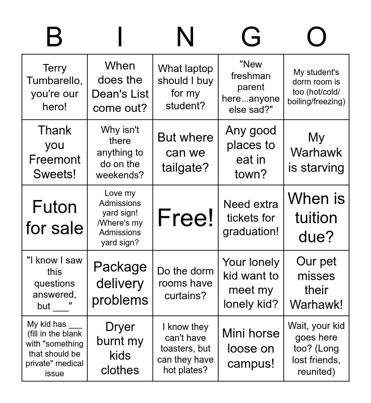 This bingo card has a free space and 24 words: Package delivery problems, Dryer burnt my kids clothes, But where can we tailgate?, My kid has ___ (fill in the blank with "something that should be private" medical issue, My student's dorm room is too (hot/cold/ boiling/freezing), Terry Tumbarello, you're our hero!, Thank you Freemont Sweets!, When does the Dean's List come out?, Need extra tickets for graduation!, Do the dorm rooms have curtains?, Any good places to eat in town?, Futon for sale, Your lonely kid want to meet my lonely kid?, Our pet misses their Warhawk!, Why isn't there anything to do on the weekends?, Mini horse loose on campus!, When is tuition due?, What laptop should I buy for my student?, My Warhawk is starving, Love my Admissions yard sign! /Where's my Admissions yard sign?, Wait, your kid goes here too? (Long lost friends, reunited), "I know I saw this questions answered, but ___", "New freshman parent here...anyone else sad?" and I know they can't have toasters, but can they have hot plates?.