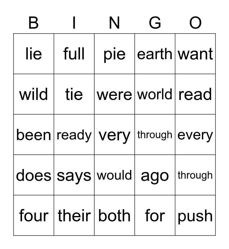 This bingo card has 31 words: both, women, ready, again, lie, pie, tie, ago, through, for, every, very, push, won't, read, thought, through, says, does, would, want, could, four, full, world, wild, earth, been, their, were and where.