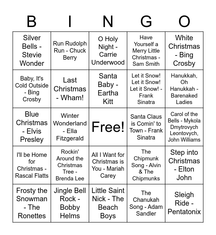 This bingo card has a free space and 24 words: Rockin' Around the Christmas Tree - Brenda Lee, Jingle Bell Rock - Bobby Helms, Santa Baby - Eartha Kitt, Frosty the Snowman - The Ronettes, White Christmas - Bing Crosby, Silver Bells - Stevie Wonder, Baby, It's Cold Outside - Bing Crosby, Run Rudolph Run - Chuck Berry, Santa Claus is Comin' to Town - Frank Sinatra, All I Want for Christmas is You - Mariah Carey, Let it Snow! Let it Snow! Let it Snow! - Frank Sinatra, Blue Christmas - Elvis Presley, The Chipmunk Song - Alvin & The Chipmunks, Step into Christmas - Elton John, Last Christmas - Wham!, The Chanukah Song - Adam Sandler, Carol of the Bells - Mykola Dmytrovych Leontovych, John Williams, O Holy Night - Carrie Underwood, Hanukkah, Oh Hanukkah - Barenaked Ladies, Winter Wonderland - Ella Fitzgerald, Sleigh Ride - Pentatonix, I'll be Home for Christmas - Rascal Flatts, Have Yourself a Merry Little Christmas - Sam Smith and Little Saint Nick - The Beach Boys.