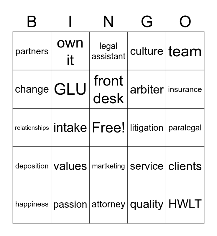 This bingo card has a free space and 24 words: values, passion, front desk, happiness, team, partners, change, own it, litigation, martketing, arbiter, relationships, service, clients, GLU, quality, paralegal, legal assistant, insurance, intake, HWLT, deposition, culture and attorney.
