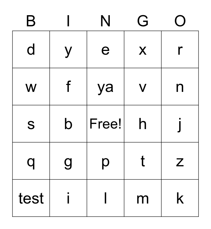 This bingo card has a free space and 29 words: test, a, b, c, d, e, f, g, h, i, j, k, l, m, n, o, p, q, r, s, t, u, v, w, x, y, z, ya and pappy.
