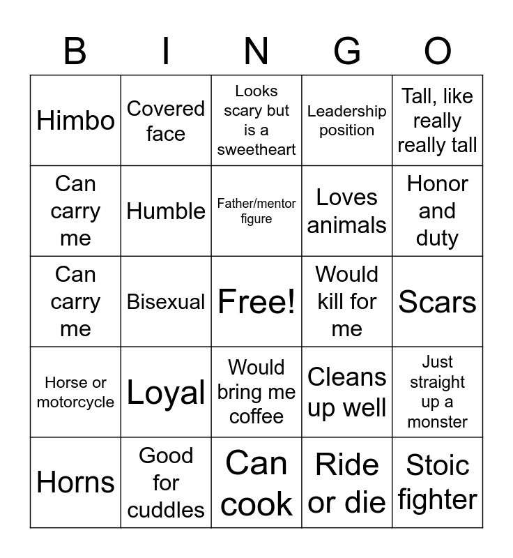 This bingo card has a free space and 24 words: Loyal, Good for cuddles, Father/mentor figure, Horns, Tall, like really really tall, Himbo, Can carry me, Covered face, Would kill for me, Would bring me coffee, Loves animals, Can carry me, Cleans up well, Just straight up a monster, Humble, Ride or die, Scars, Looks scary but is a sweetheart, Honor and duty, Bisexual, Stoic fighter, Horse or motorcycle, Leadership position and Can cook.