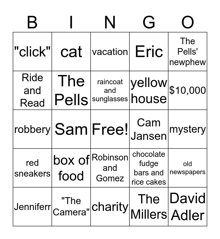 This bingo card has a free space and 24 words: box of food, "The Camera", raincoat and sunglasses, Jenniferr, The Pells' newphew, "click", Ride and Read, cat, Cam Jansen, Robinson and Gomez, yellow house, robbery, chocolate fudge bars and rice cakes, old newspapers, The Pells, The Millers, mystery, vacation, $10,000, Sam, David Adler, red sneakers, Eric and charity.