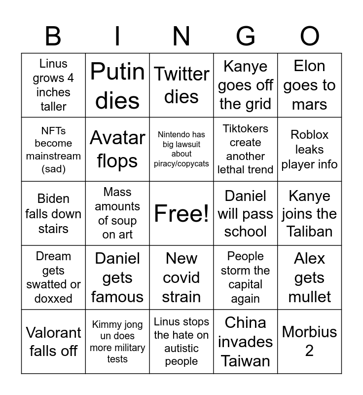 This bingo card has a free space and 24 words: Daniel gets famous, Kimmy jong un does more military tests, Nintendo has big lawsuit about piracy/copycats, Valorant falls off, Elon goes to mars, Linus grows 4 inches taller, NFTs become mainstream (sad), Putin dies, Daniel will pass school, New covid strain, Tiktokers create another lethal trend, Biden falls down stairs, People storm the capital again, Alex gets mullet, Avatar flops, China invades Taiwan, Kanye joins the Taliban, Twitter dies, Roblox leaks player info, Mass amounts of soup on art, Morbius 2, Dream gets swatted or doxxed, Kanye goes off the grid and Linus stops the hate on autistic people.