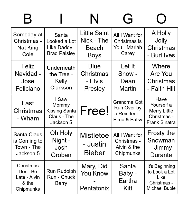This bingo card has a free space and 35 words: I want a hippopotamus for Christmas - Gayle Peevey, White Christmas - Bing Crosby, Rockin' Round the Christmas Tree -Brenda Lee, Underneath the Tree - Kelly Clarkson, Mistletoe - Justin Bieber, All I Want for Christmas is You - Mariah Carey, Feliz Navidad - Jose Feliciano, Jingle Bell Rock - Bobby Helms, Blue Christmas - Elvis Presley, You're a Mean One, Mr. Grinch - Boris Karloff, Last Christmas - Wham, A Holly Jolly Christmas - Burl Ives, It's the Most Wonderful Time of the Year - Andy Williams, The Christmas Song - Nat King Cole, Someday at Christmas - Nat King Cole, Grandma Got Run Over by a Reindeer - Elmo & Patsy, Santa Baby - Eartha Kitt, I Saw Mommy Kissing Santa Claus - The Jackson 5, Santa Claus is Coming to Town - The Jackson 5, It's Beginning to Look a Lot Like Christmas - Michael Buble, All I Want for Christmas - Alvin & the Chipmunks, Christmas Don't Be Late - Alvin & the Chipmunks, Frosty the Snowman - Jimmy Durante, Run Rudolph Run - Chuck Berry, Little Saint Nick - The Beach Boys, Where Are You Christmas - Faith Hill, Scrooge - The Muppets, Marley and Marley - The Muppets, Let It Snow - Dean Martin, Have Yourself a Merry Little Christmas - Frank Sinatra, Silent Night - Nat King Cole, Mary, Did You Know - Pentatonix, Oh Holy Night - Josh Groban, Santa Looked a Lot Like Daddy - Brad Paisley and O Tannenbaum - Vince Guaraldi Trio.