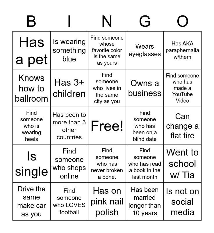 This bingo card has a free space and 34 words: Plays a musical instrument, Has been married longer than 10 years, Has pic of there children as their lock screen, Has the same color shirt as you, Is single, Has 3+ children, Has AKA paraphernalia w/them, Drive the same make car as you, Is wearing something blue, Find someone who is born in the same month as you, Find someone who lives in the same city as you, Find someone whose favorite color is the same as yours, Find someone who knows Tia's middle name (name it), Find someone who has never been on a cruise ship, Find someone who has been on a blind date, Find someone who has made a YouTube Video, Find someone who LOVES football, Find someone who is wearing heels, Find someone who shops online, Find someone who has read a book in the last month, Find someone who has never broken a bone., Wears same size shoe as you, Has a pet, Can change a flat tire, Has on pink nail polish, Is not on social media, Wears eyeglasses, Speak another language, Owns a business, Knows how to ballroom, Has met someone famous, Has been to more than 3 other countries, Went to school w/ Tia and Works/worked w/ the Tia.
