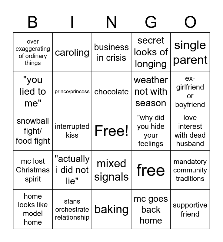 This bingo card has a free space and 25 words: "actually i did not lie", baking, chocolate, home looks like model home, single parent, over exaggerating of ordinary things, "you lied to me", caroling, "why did you hide your feelings, mixed signals, weather not with season, snowball fight/ food fight, free, mandatory community traditions, prince/princess, planning event, love interest with dead husband, business in crisis, ex-girlfriend or boyfriend, interrupted kiss, supportive friend, stans orchestrate relationship, mc lost Christmas spirit, secret looks of longing and mc goes back home.