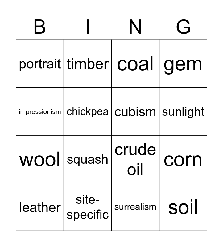 This bingo card has 29 words: expressionism, oats, corn, pea, portrait, coal, cubism, open air, site- specific, barley, surrealism, leather, still life, abstract, squash, iron, wheat, soil, impressionism, crude oil, silk, pop art, wool, chickpea, gem, timber, landscape, sunlight and honey.