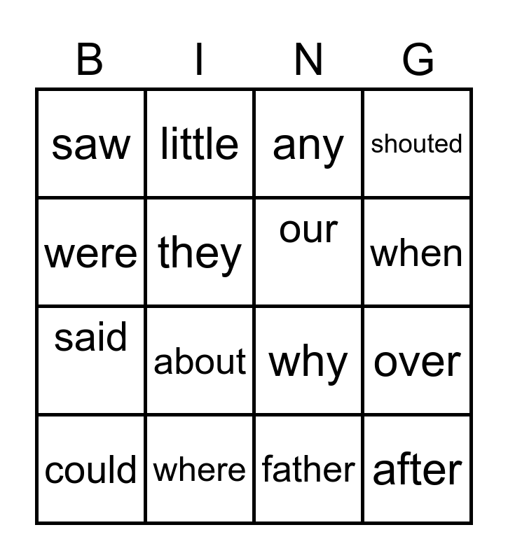 This bingo card has 24 words: from, very, when, girl, were, saw, they, little, where, away, said, why, came, mother, our, I'm, father, any, about, over, could, after, shouted and with.
