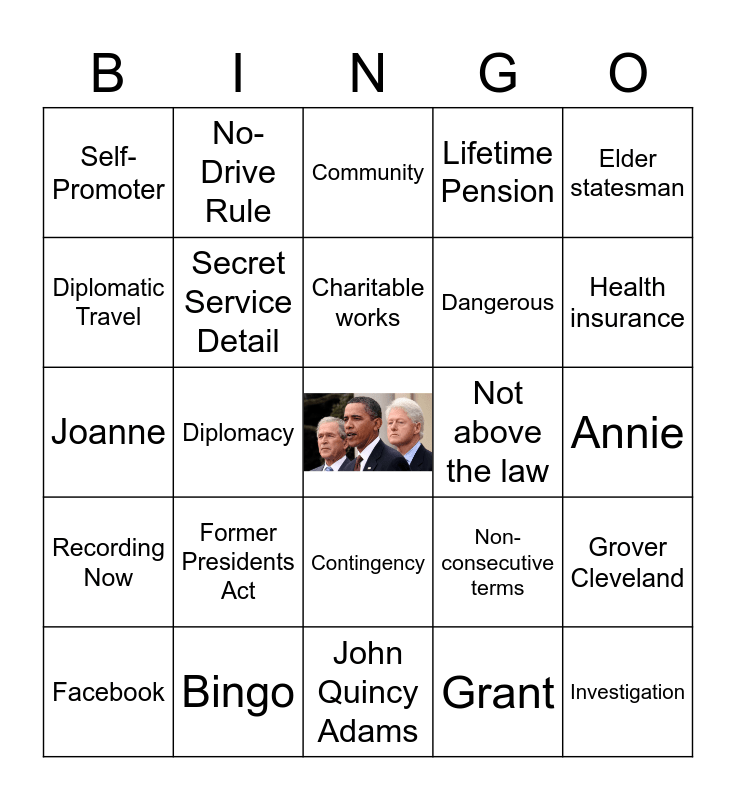 This bingo card has a free space and 50 words: Trump, Investigation, Subpoena, John Quincy Adams, Former Presidents Act, Presidential Library, No-Drive Rule, Powers, Diplomatic Travel, National Security Briefings, Secret Service Detail, Lifetime Pension, Grover Cleveland, Non-consecutive terms, Classified information, Private Citizen, Charitable works, Not above the law, No selling secrets, Elder statesman, Diplomacy, Grant, Self-Promoter, Dangerous, Holidays, Medical care, Health insurance, Secret Service, Community, Contingency, Podcast, Links, Rules of the Game, Chat, Bingo, Q&A, Mug, Newbie, NCHE, Annie, Week/Episode count, Poof!, Coffee, Karalee, Facebook, Joanne, The Voice, Partner in Crime, Recording Now and After Party.