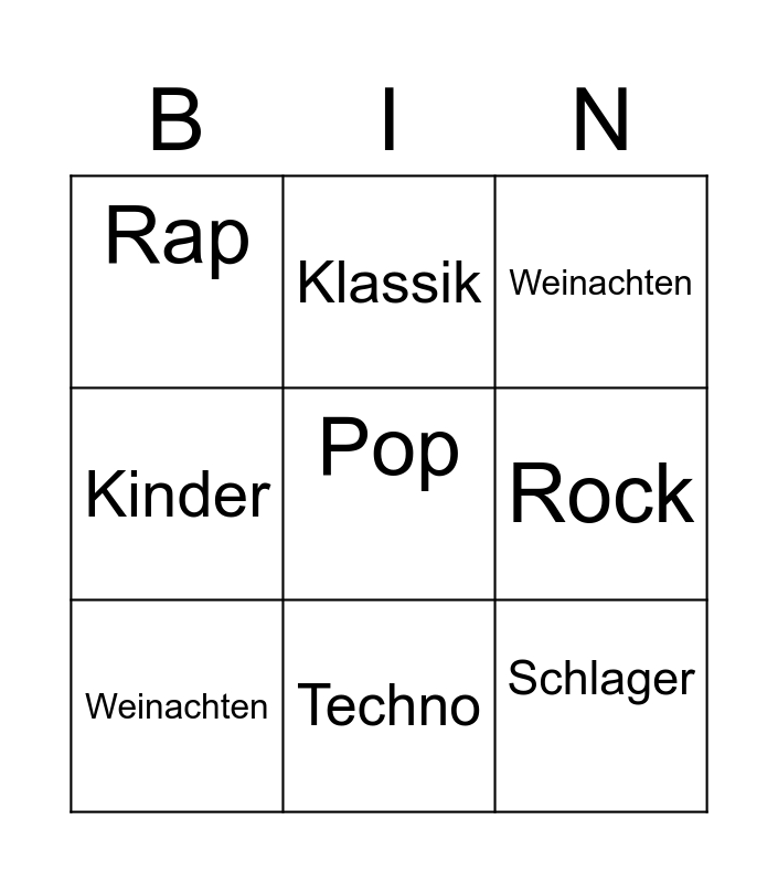 This bingo card has 9 words: Weinachten, Pop, Weinachten, Rap, Klassik, Rock, Kinder, Techno and Schlager.