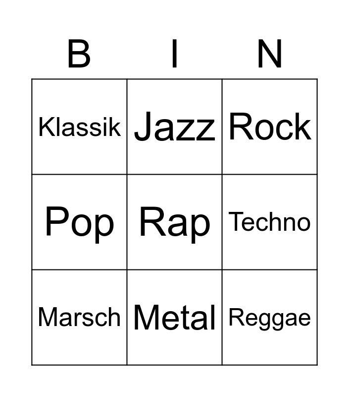 This bingo card has 9 words: Marsch, Rap, Rock, Klassik, Jazz, Techno, Pop, Metal and Reggae.