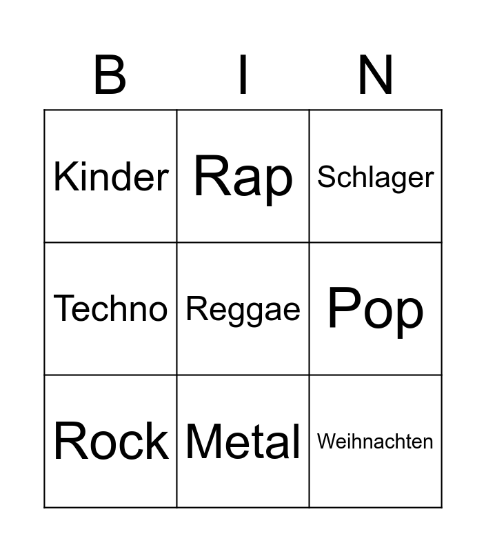 This bingo card has 9 words: Rock, Reggae, Schlager, Kinder, Rap, Pop, Techno, Metal and Weihnachten.