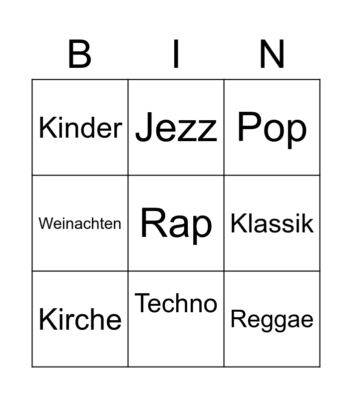 This bingo card has 9 words: Kirche, Rap, Pop, Kinder, Jezz, Klassik, Weinachten, Techno and Reggae.
