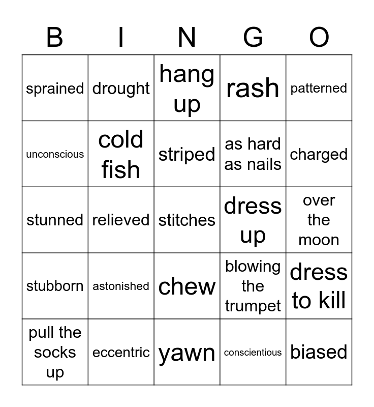 This bingo card has 59 words: Free!, eccentric, immature, stubborn, conscientious, insincere, cold fish, heart of gold, as hard as nails, pain in the neck, rash, blister, unconscious, faint, bruise, sprained, stitches, patterned, plain, striped, dress up, hang up, pull the socks up, dress to kill, bribery, fraud, hijacking, theft, charged, capital punishment, gale-force, mild, showers, blizzard, drought, monsoon, hailstorm, relieved, fed up, stunned, miserable, astonished, over the moon, scared stiff, down in the dumps, calf, thigh, kidneys, chew, yawn, pulling the leg, get off the chest, choir, tenor, face the music, blowing the trumpet, paparazzi, biased and censored.