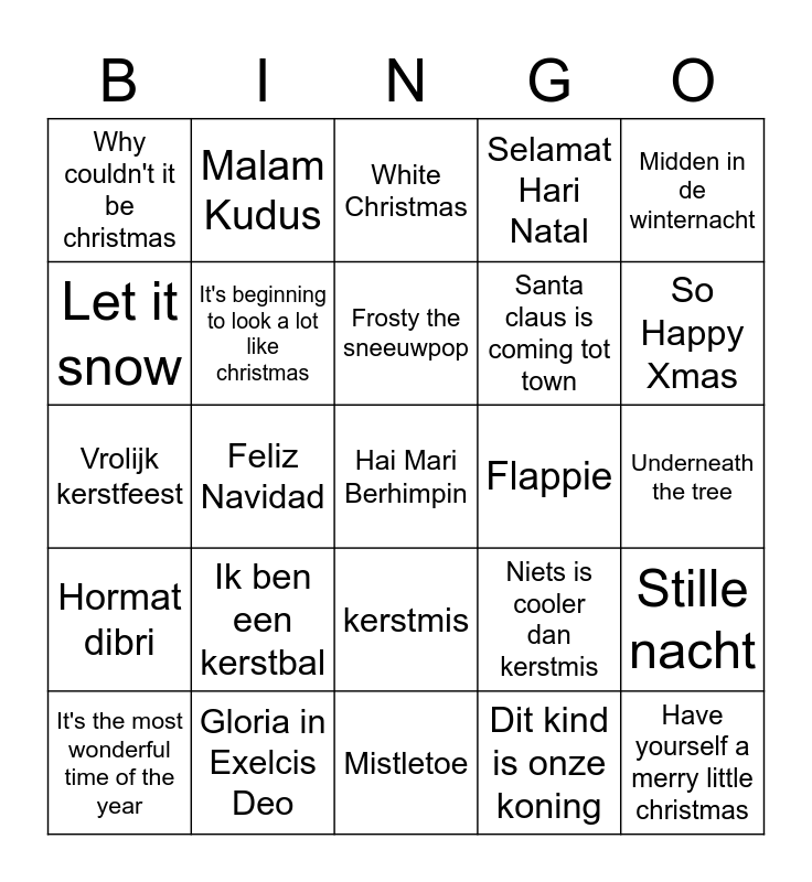 This bingo card has 25 words: Ik ben een kerstbal, Mistletoe, Frosty the sneeuwpop, It's the most wonderful time of the year, Midden in de winternacht, Why couldn't it be christmas, Let it snow, Malam Kudus, Flappie, kerstmis, Santa claus is coming tot town, Vrolijk kerstfeest, Niets is cooler dan kerstmis, Stille nacht, It's beginning to look a lot like christmas, Have yourself a merry little christmas, Underneath the tree, White Christmas, So Happy Xmas, Feliz Navidad, Hai Mari Berhimpin, Gloria in Exelcis Deo, Hormat dibri, Selamat Hari Natal and Dit kind is onze koning.