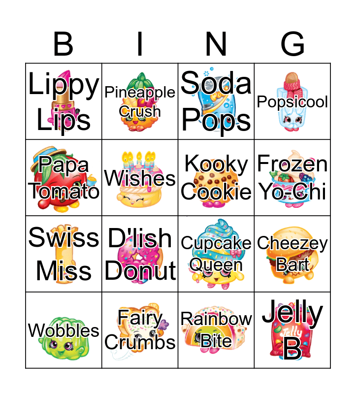 This bingo card has 15 images, a free space and 15 words: Wobbles, Jelly B, Soda Pops, Lippy Lips, Frozen Yo-Chi, Papa Tomato, D'lish Donut, Rainbow Bite, Wishes, Swiss Miss, Cheezey Bart, Popsicool, Kooky Cookie, Pineapple Crush and Fairy Crumbs.