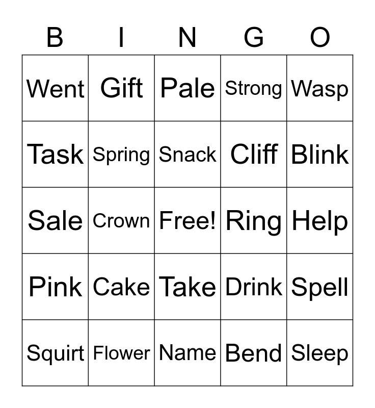 This bingo card has a free space and 24 words: Cake, Flower, Snack, Squirt, Wasp, Went, Task, Gift, Ring, Take, Cliff, Sale, Drink, Spell, Spring, Bend, Help, Pale, Blink, Crown, Sleep, Pink, Strong and Name.