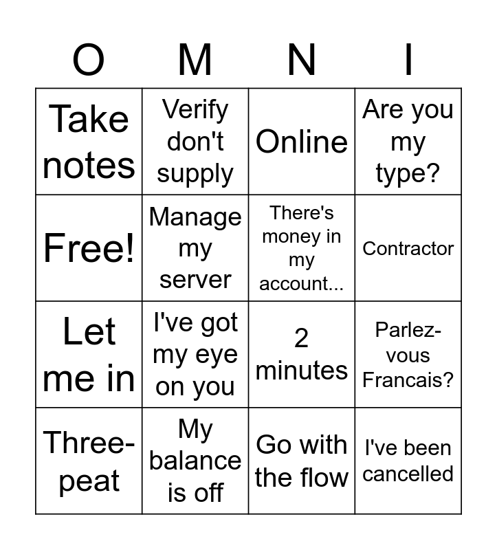 This bingo card has 16 words: My balance is off, Parlez-vous Francais?, Online, Take notes, Let me in, Verify don't supply, 2 minutes, Go with the flow, Free!, Manage my server, Three-peat, Are you my type?, I've got my eye on you, Contractor, There's money in my account... and I've been cancelled.