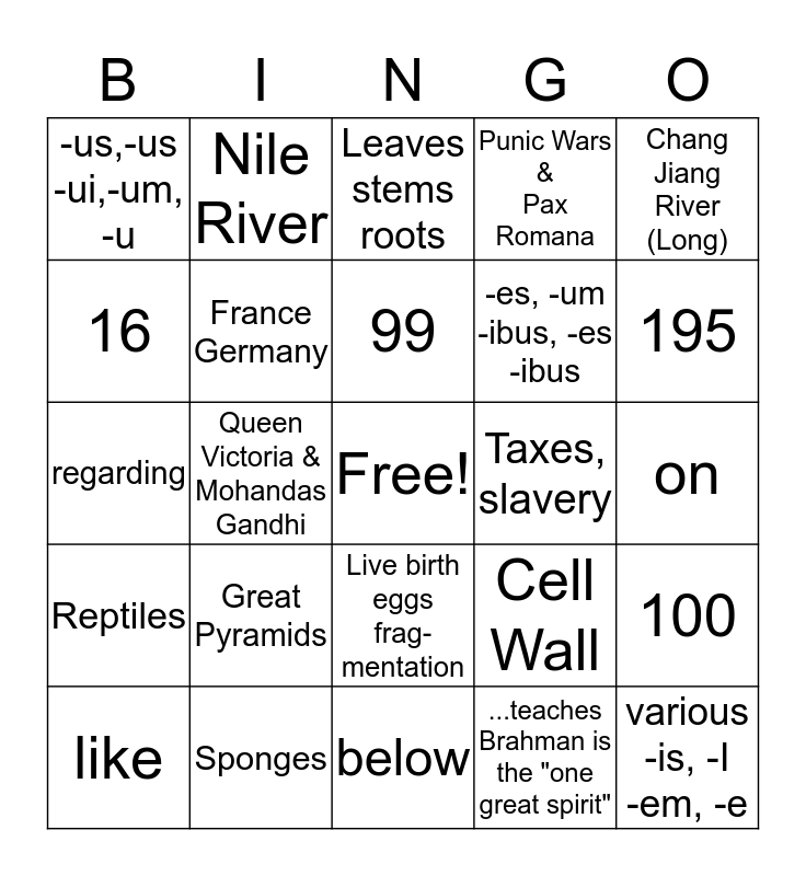 This bingo card has a free space and 24 words: Great Pyramids, Sponges, 99, like, Chang Jiang River (Long), -us,-us -ui,-um, -u, 16, Nile River, Taxes, slavery, Live birth eggs frag- mentation, -es, -um -ibus, -es -ibus, regarding, Cell Wall, 100, France Germany, ...teaches Brahman is the "one great spirit", on, Leaves stems roots, 195, Queen Victoria & Mohandas Gandhi, various -is, -I -em, -e, Reptiles, Punic Wars & Pax Romana and below.