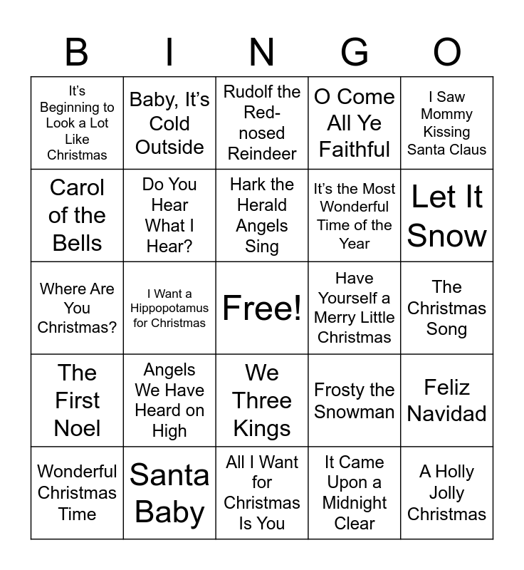 This bingo card has a free space and 52 words: 12 Days of Christmas, A Holly Jolly Christmas, All I Want for Christmas is My Two Front Teeth, All I Want for Christmas Is You, Angels We Have Heard on High, Away in a Manger, Baby, It’s Cold Outside, Blue Christmas, Carol of the Bells, Deck the Halls, Do You Hear What I Hear?, Do You Want to Build a Snowman?, Feliz Navidad, Frosty the Snowman, God Rest Ye Merry Gentlemen, Grandma Got Run Over by a Reindeer, Hark the Herald Angels Sing, Have Yourself a Merry Little Christmas, Here Comes Santa Claus, I Saw Mommy Kissing Santa Claus, I Want a Hippopotamus for Christmas, It Came Upon a Midnight Clear, It’s Beginning to Look a Lot Like Christmas, It’s the Most Wonderful Time of the Year, Jingle Bell Rock, Jingle Bells, Joy to the World, Last Christmas, Let It Snow, Little Drummer Boy, Mary, Did You Know?, O Come All Ye Faithful, O Holy Night, O, Little Town of Bethlehem, Rockin’ Around the Christmas Tree, Rudolf the Red-nosed Reindeer, Santa Baby, Santa Claus is Coming to Town, Silent Night, Silver Bells, Sleigh Ride, The Christmas Song, The First Noel, Up On the Housetop, We Three Kings, We Wish You a Merry Christmas, What Child is This, Where Are You Christmas?, White Christmas, Winter Wonderland, Wonderful Christmas Time and You’re a Mean One, Mr. Grinch.