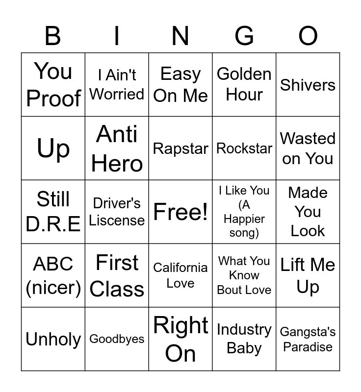 This bingo card has a free space and 24 words: First Class, Goodbyes, Rapstar, Unholy, Shivers, You Proof, Up, I Ain't Worried, I Like You (A Happier song), California Love, Rockstar, Still D.R.E, What You Know Bout Love, Lift Me Up, Anti Hero, Industry Baby, Made You Look, Easy On Me, Wasted on You, Driver's Liscense, Gangsta's Paradise, ABC (nicer), Golden Hour and Right On.
