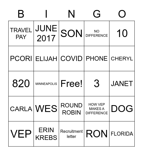 This bingo card has a free space and 24 words: WES, ERIN KREBS, COVID, VEP, 10, TRAVEL PAY, PCORI, JUNE 2017, 3, ROUND ROBIN, PHONE, 820, HOW VEP MAKES A DIFFERENCE, DOG, ELIJAH, RON, JANET, SON, CHERYL, MINNEAPOLIS, FLORIDA, CARLA, NO DIFFERENCE and Recruitment letter.