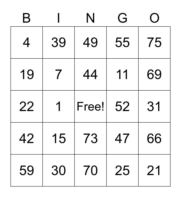 This bingo card has a free space and 24 words: 15, 30, 44, 59, 75, 4, 19, 39, 52, 73, 11, 22, 47, 66, 7, 25, 31, 49, 69, 1, 21, 42, 55 and 70.