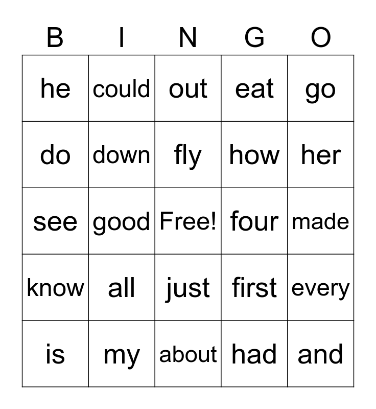 This bingo card has a free space and 48 words: a, and, are, about, all, by, could, call, do, day, down, eat, every, first, find, for, fly, four, from, go, good, had, he, how, have, her, is, I, just, know, like, little, live, look, my, many, make, made, now, one, our, of, out, put, see, she, said and saw.