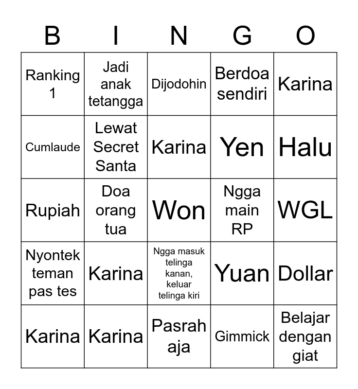This bingo card has a free space and 24 words: Karina, Karina, Karina, Karina, Karina, Ranking 1, Cumlaude, Jadi anak tetangga, Ngga main RP, Ngga masuk telinga kanan, keluar telinga kiri, Yen, Rupiah, Yuan, Dollar, Lewat Secret Santa, Gimmick, WGL, Dijodohin, Halu, Doa orang tua, Belajar dengan giat, Nyontek teman pas tes, Berdoa sendiri and Pasrah aja.