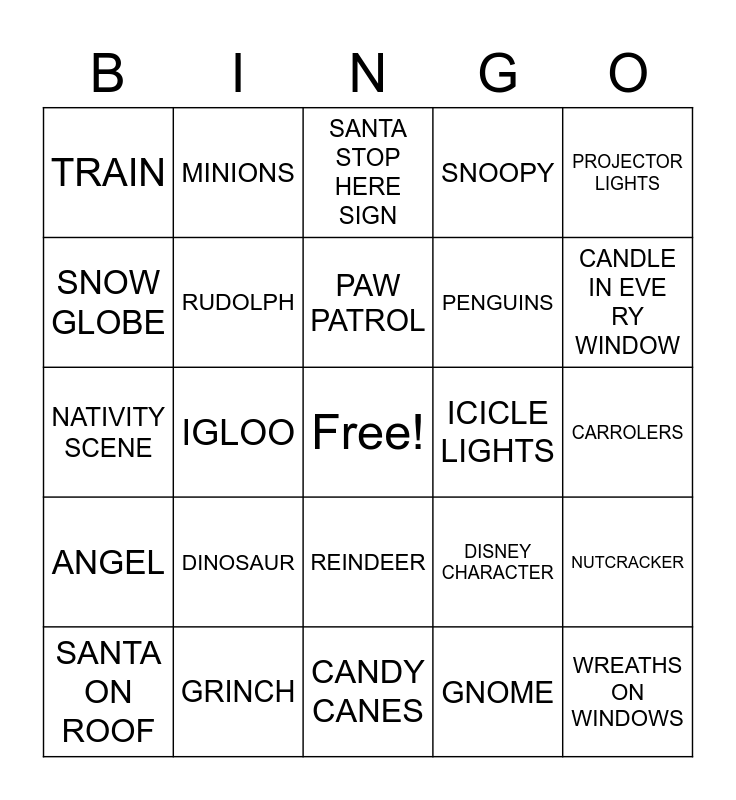 This bingo card has a free space and 24 words: DINOSAUR, GRINCH, PAW PATROL, SANTA ON ROOF, PROJECTOR LIGHTS, TRAIN, SNOW GLOBE, MINIONS, ICICLE LIGHTS, REINDEER, PENGUINS, NATIVITY SCENE, DISNEY CHARACTER, NUTCRACKER, RUDOLPH, GNOME, CARROLERS, SANTA STOP HERE SIGN, CANDLE IN EVERY WINDOW, IGLOO, WREATHS ON WINDOWS, ANGEL, SNOOPY and CANDY CANES.