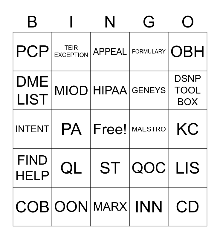 This bingo card has a free space and 29 words: COB, OPTUM RX, PA, DMEVS, PCP, APPEAL, MIOD, QL, MAESTRO, OON, KC, CD, MARX, INN, DSNP TOOL BOX, VG, ST, FIND HELP, OBH, INTENT, QOC, MME, GENEYS, DME LIST, FORMULARY, TEIR EXCEPTION, LIS, HIPAA and UCARD.