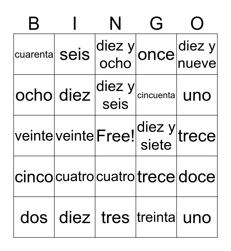 This bingo card has a free space and 48 words: cero, uno, dos, tres, cuatro, cinco, seis, siete, ocho, nueve, diez, once, doce, trece, catorce, quince, diez y seis, diez y siete, diez y ocho, diez y nueve, veinte, treinta, cuarenta, cincuenta, cero, uno, dos, tres, cuatro, cinco, seis, siete, ocho, nueve, diez, once, doce, trece, catorce, quince, diez y seis, diez y siete, diez y ocho, diez y nueve, veinte, treinta, cuarenta and cincuenta.