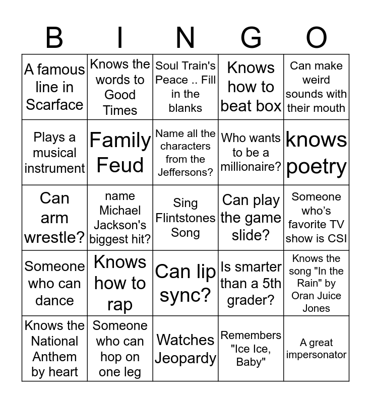 This bingo card has 25 words: Knows how to rap, Watches Jeopardy, Name all the characters from the Jeffersons?, Knows the National Anthem by heart, Can make weird sounds with their mouth, A famous line in Scarface, Plays a musical instrument, Knows the words to Good Times, Can play the game slide?, Can lip sync?, Who wants to be a millionaire?, Can arm wrestle?, Is smarter than a 5th grader?, Knows the song "In the Rain" by Oran Juice Jones, Family Feud, A great impersonator, Someone who’s favorite TV show is CSI, Soul Train's Peace .. Fill in the blanks, knows poetry, name Michael Jackson's biggest hit?, Sing Flintstones Song, Someone who can hop on one leg, Someone who can dance, Knows how to beat box and Remembers "Ice Ice, Baby".
