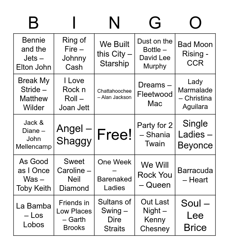 This bingo card has a free space and 25 words: Sweet Caroline – Neil Diamond, Sultans of Swing – Dire Straits, Chattahoochee – Alan Jackson, La Bamba – Los Lobos, Bad Moon Rising - CCR, Bennie and the Jets – Elton John, Break My Stride – Matthew Wilder, Ring of Fire – Johnny Cash, Party for 2 – Shania Twain, One Week – Barenaked Ladies, Dreams – Fleetwood Mac, Jack & Diane – John Mellencamp, We Will Rock You – Queen, Barracuda – Heart, I Love Rock n Roll – Joan Jett, Fishin in the Dark – Nitty Gritty Dirt Band, Single Ladies – Beyonce, We Built this City – Starship, Lady Marmalade – Christina Aguilara, Angel – Shaggy, Soul – Lee Brice, Friends in Low Places – Garth Brooks, As Good as I Once Was – Toby Keith, Dust on the Bottle – David Lee Murphy and Out Last Night – Kenny Chesney.
