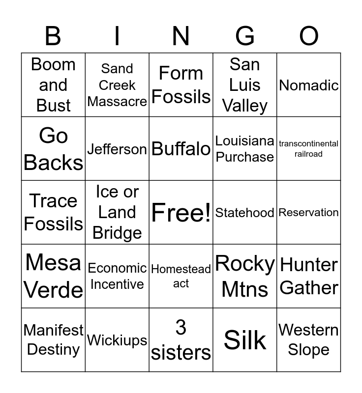 This bingo card has a free space and 24 words: Economic Incentive, Wickiups, Buffalo, Manifest Destiny, Nomadic, Boom and Bust, Go Backs, Sand Creek Massacre, Statehood, Homestead act, Louisiana Purchase, Trace Fossils, Rocky Mtns, Hunter Gather, Jefferson, Silk, Reservation, Form Fossils, transcontinental railroad, Ice or Land Bridge, Western Slope, Mesa Verde, San Luis Valley and 3 sisters.
