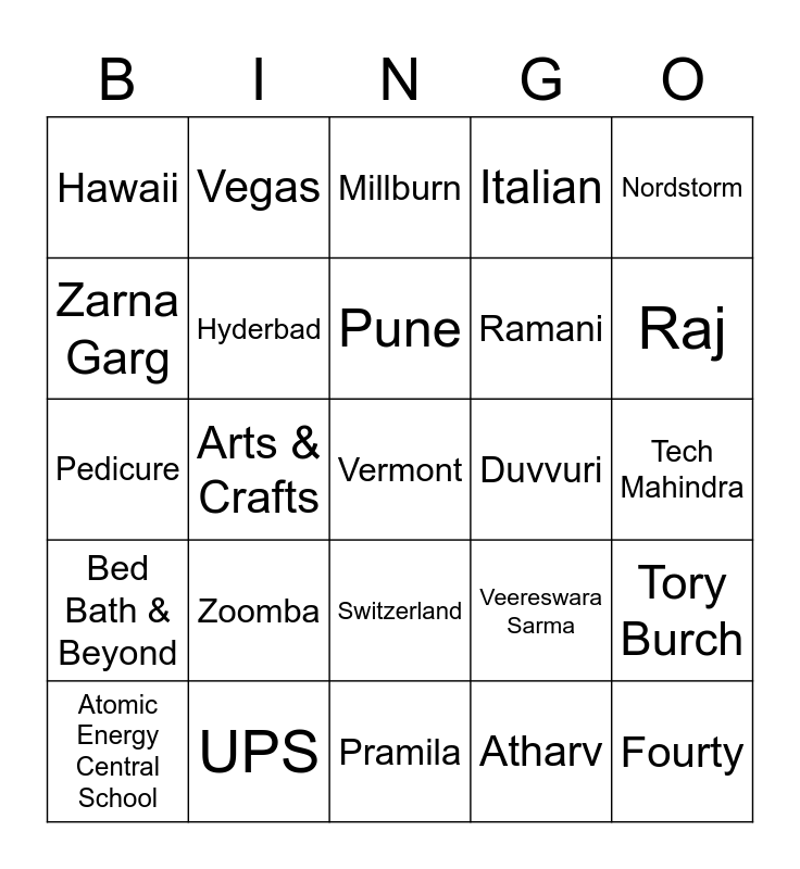 This bingo card has 27 words: Atomic Energy Central School, UPS, Pune, Atharv, Raj, Hawaii, Vegas, Switzerland, Ramani, Fourty, Pedicure, Hyderbad, Pramila, Veereswara Sarma, Tech Mahindra, Honda Civic, Arts & Crafts, Millburn, Duvvuri, Nordstorm, Bed Bath & Beyond, Zoomba, Vermont, Italian, Tory Burch, Zarna Garg and Instapot.