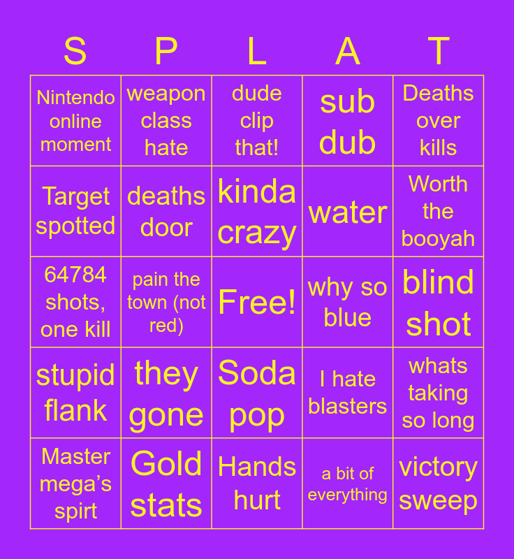 This bingo card has a free space and 49 words: super cucked, Booyah, Double wipeout, a bit of everything, blind shot, Invisible getaway, weapon class hate, utter domination, water, the 0.01, Target spotted, pain the town (not red), I hate blasters, victory sweep, Ranked lane, Party in back, dude clip that!, why so blue, cluch, Nintendo online moment, Gold stats, Hands hurt, sub dub, Deaths over kills, 2 in one, they gone, kinda crazy, overtime, whats taking so long, stupid flank, Free!, Soda pop, Come here often?, Refreshment, Master mega’s spirt, What are they doing, fair trade, Refreshing, Worth the booyah, homing action, Unseen, dodge, tenta missiles are still busted, calculated, 64784 shots, one kill, deaths door, Special spam, not telling you what this is but ill tell you when you get it lol and close and personal.