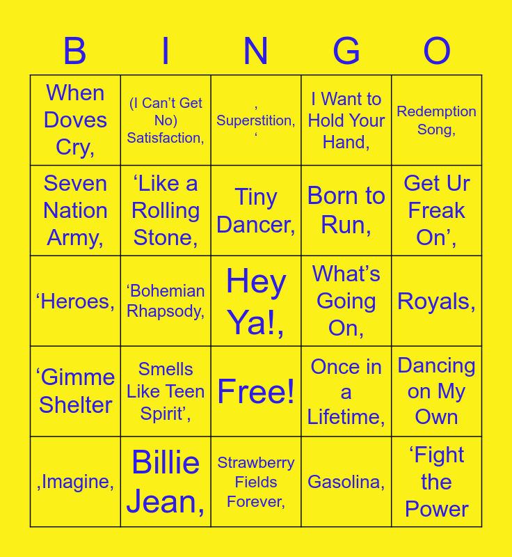 This bingo card has 26 words: Free!, Gasolina,, Tiny Dancer,, Billie Jean,, Redemption Song,, When Doves Cry,, Seven Nation Army,, (I Can’t Get No) Satisfaction,, Royals,, Once in a Lifetime,, Born to Run,, ‘Heroes,, Dancing on My Own, ,Imagine,, ‘Bohemian Rhapsody,, Crazy in Love,, I Want to Hold Your Hand,, ‘Gimme Shelter, , Superstition, ‘, Hey Ya!,, Get Ur Freak On’,, Strawberry Fields Forever,, What’s Going On,, Smells Like Teen Spirit’,, ‘Like a Rolling Stone, and ‘Fight the Power.