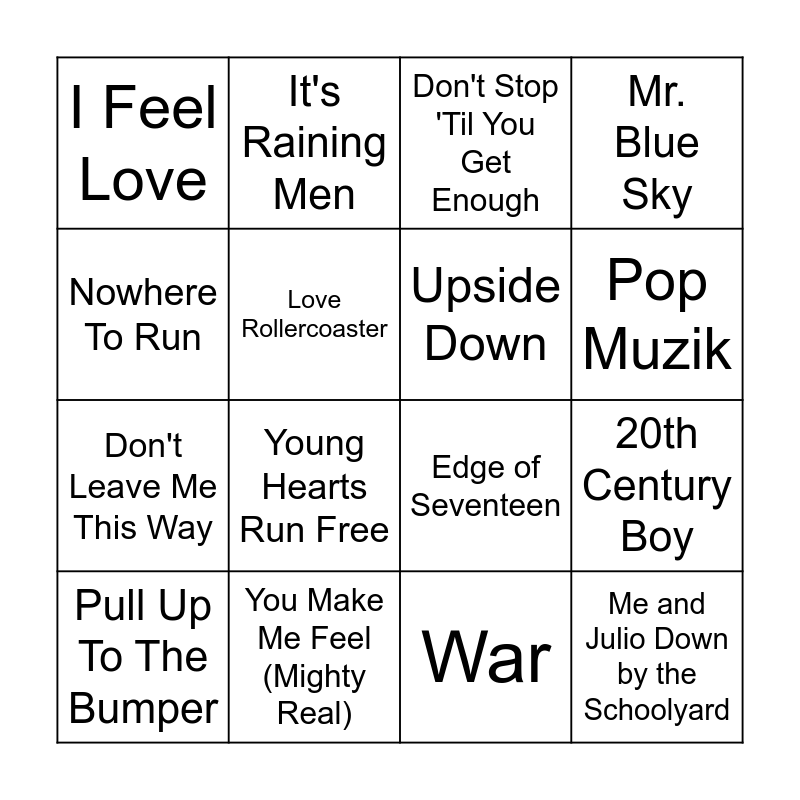 This bingo card has 88 words: Dancing Queen, Boogie Wonderland (with The Emotions), Proud Mary, Move on Up, Love Train, The First, The Last, My Everything, Lady Marmalade, That's the Way (I Like It), Ain't No Mountain High Enough, Lovin' You, Because the Night, Wuthering Heights, Cold as Ice, War, My Best Friend's Girl, Pop Muzik, Down Down - Single Version, This Town Ain't Big Enough For Both Of Us, Kung Fu Fighting, Go Your Own Way, Do Ya Think I'm Sexy, September, Edge of Seventeen, This Must Be the Place, Mamma Mia, Bennie And The Jets, Your Song, Boogie Wonderland, Rocket Man, Stuck In The Middle With You, Don't Stop 'Til You Get Enough, Mr. Blue Sky, Heroes, How Deep Is Your Love, Superfly, Love Rollercoaster, I Feel Love, Got to Be Real, Every 1's a Winner, Young Hearts Run Free, 20th Century Boy, Sir Duke, Good Times, The Model, You Make Me Feel (Mighty Real), Psycho Killer, Are You Ready For Love?, Sunny, Shaft, Don't Leave Me This Way, Rock with You, A Little Less Conversation, Bad Girls, You Should Be Dancing, Car Wash, Rasputin, Me and Julio Down by the Schoolyard, It's Raining Men, Funky Town, Hot Stuff, Step Into Christmas, Wonderful Christmastime, Heart Of Glass, Mary's Boy Child, Frosty the Snowman, Christmas (Baby Please Come Home), I Believe In Miracles, Upside Down, White Lines (Don't Do It), Pull Up To The Bumper, Never Too Much, What A Man, Son Of A Preacher Man, Nowhere To Run, You Sexy Thing, Play That Funky Music, I Will Survive, Jolene, You're so Vain, Rock Lobster, Don't Leave Me This Way, Gypsys, Tramps & Thieves, Little Green Bag, Changes, Boogie Nights, Superstition, Everybody Dance and California Soul.