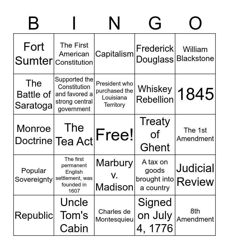 This bingo card has a free space and 24 words: The first permanent English settlement, was founded in 1607, Uncle Tom's Cabin, President who purchased the Louisiana Territory, Republic, William Blackstone, Fort Sumter, The Battle of Saratoga, The First American Constitution, Treaty of Ghent, Marbury v. Madison, Whiskey Rebellion, Monroe Doctrine, A tax on goods brought into a country, Judicial Review, Supported the Constitution and favored a strong central government, Signed on July 4, 1776, The 1st Amendment, Capitalism, 1845, The Tea Act, 8th Amendment, Popular Sovereignty, Frederick Douglass and Charles de Montesquieu.