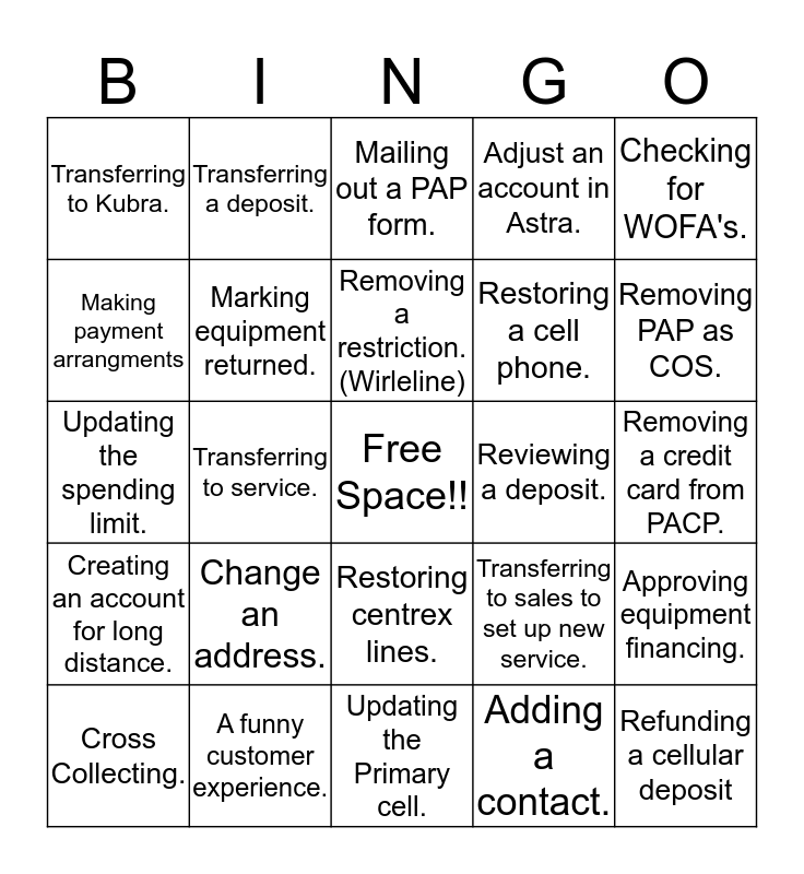 This bingo card has a free space and 24 words: Change an address., A funny customer experience., Removing a restriction. (Wirleline), Cross Collecting., Checking for WOFA's., Transferring to Kubra., Making payment arrangments, Transferring a deposit., Reviewing a deposit., Restoring centrex lines., Restoring a cell phone., Updating the spending limit., Transferring to sales to set up new service., Approving equipment financing., Marking equipment returned., Adding a contact., Removing a credit card from PACP., Mailing out a PAP form., Removing PAP as COS., Transferring to service., Refunding a cellular deposit, Creating an account for long distance., Adjust an account in Astra. and Updating the Primary cell..