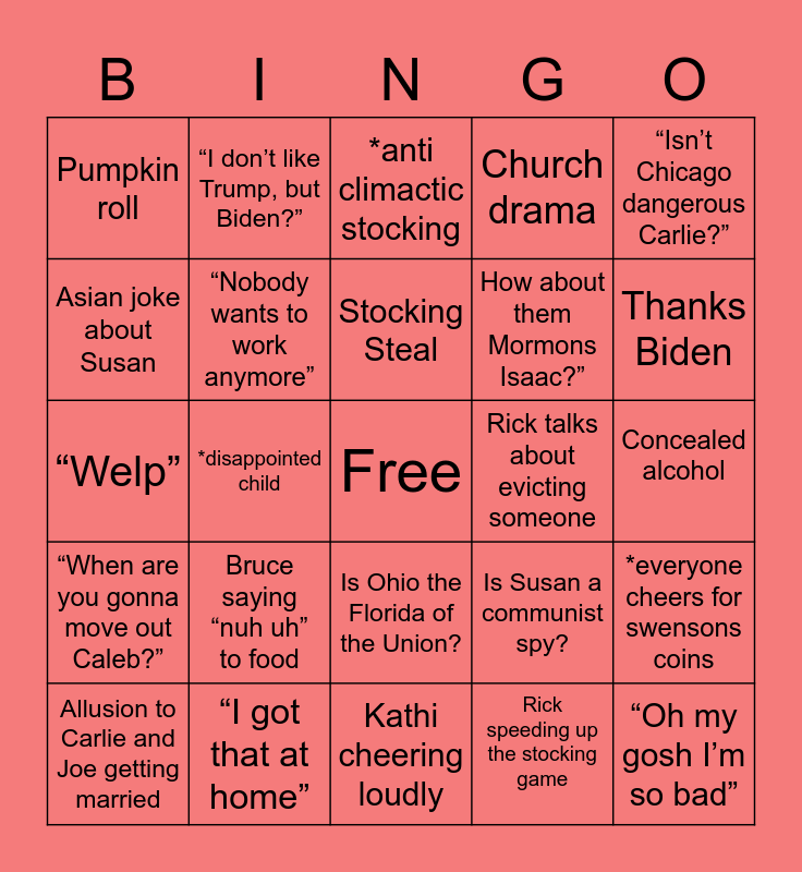 This bingo card has a free space and 24 words: Bruce saying “nuh uh” to food, “I got that at home”, Stocking Steal, Allusion to Carlie and Joe getting married, “Isn’t Chicago dangerous Carlie?”, Pumpkin roll, Asian joke about Susan, “I don’t like Trump, but Biden?”, Rick talks about evicting someone, Is Ohio the Florida of the Union?, How about them Mormons Isaac?”, “Welp”, Is Susan a communist spy?, *everyone cheers for swensons coins, “Nobody wants to work anymore”, Rick speeding up the stocking game, Concealed alcohol, *anti climactic stocking, Thanks Biden, *disappointed child, “Oh my gosh I’m so bad”, “When are you gonna move out Caleb?”, Church drama and Kathi cheering loudly.