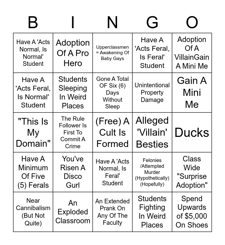This bingo card has a free space and 24 words: You've Risen A Disco Gurl, An Exploded Classroom, Gone A Total OF Six (6) Days Without Sleep, Near Cannibalism (But Not Quite), Adoption Of A VillainGain A Mini Me, Have A 'Acts Normal, Is Normal' Student, Have A 'Acts Feral, Is Normal' Student, Adoption Of A Pro Hero, Alleged 'Villain' Besties, Have A 'Acts Normal, Is Feral' Student, Unintentional Property Damage, "This Is My Domain", Felonies /Attempted Murder (Hypothetically) (Hopefully), Class Wide "Surprise Adoption", Students Sleeping In Weird Places, Students Fighting In Weird Places, Ducks, Upperclassmen = Awakening Of Baby Gays, Gain A Mini Me, The Rule Follower Is First To Commit A Crime, Spend Upwards of $5,000 On Shoes, Have A Minimum Of Five (5) Ferals, Have A 'Acts Feral, Is Feral' Student and An Extended Prank On Any Of The Faculty.