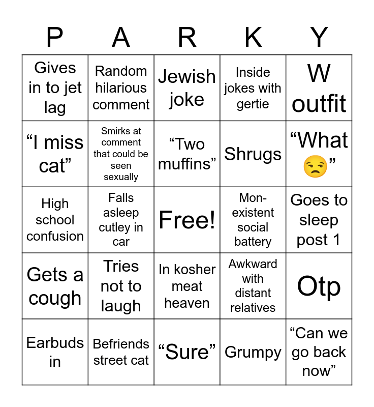 This bingo card has a free space and 24 words: Tries not to laugh, Befriends street cat, “Two muffins”, Earbuds in, W outfit, Gives in to jet lag, “I miss cat”, Random hilarious comment, Mon-existent social battery, In kosher meat heaven, Shrugs, High school confusion, Awkward with distant relatives, Otp, Smirks at comment that could be seen sexually, Grumpy, Goes to sleep post 1, Jewish joke, “What 😒”, Falls asleep cutley in car, “Can we go back now”, Gets a cough, Inside jokes with gertie and “Sure”.