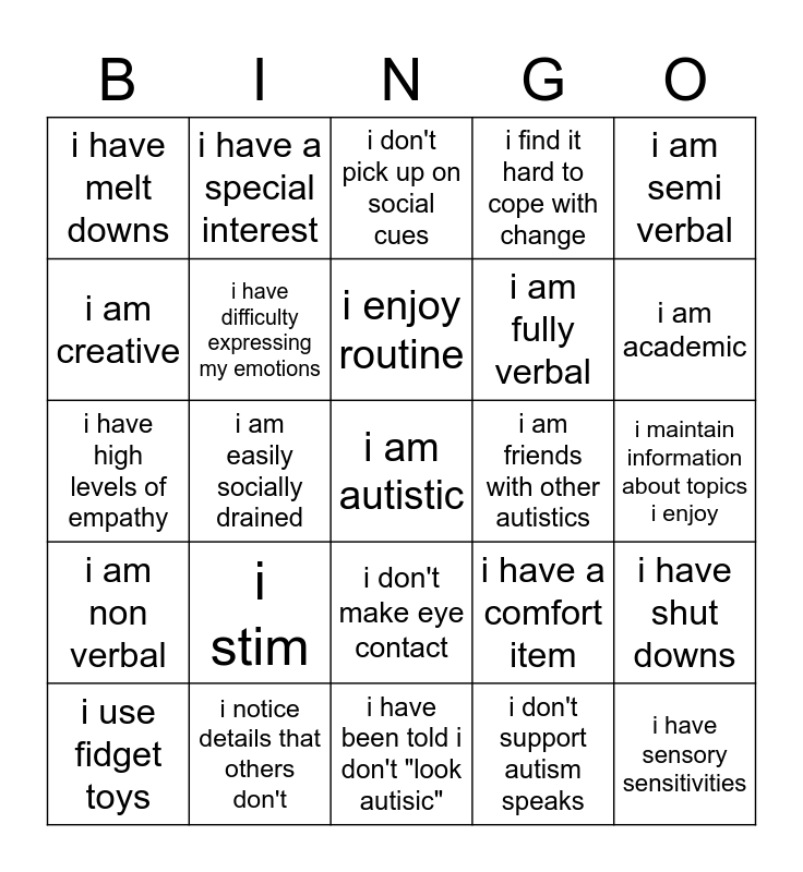 This bingo card has a free space and 24 words: i stim, i notice details that others don't, i enjoy routine, i use fidget toys, i am semi verbal, i have melt downs, i am creative, i have a special interest, i am friends with other autistics, i don't make eye contact, i am fully verbal, i have high levels of empathy, i have a comfort item, i have shut downs, i have difficulty expressing my emotions, i don't support autism speaks, i maintain information about topics i enjoy, i don't pick up on social cues, i am academic, i am easily socially drained, i have sensory sensitivities, i am non verbal, i find it hard to cope with change and i have been told i don't "look autisic".