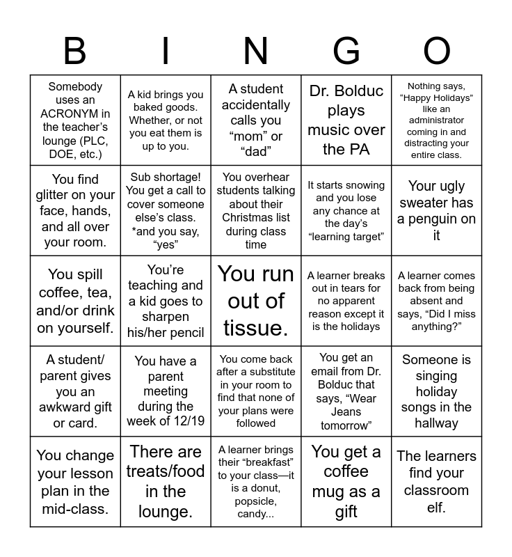 This bingo card has 26 words: You come back after a substitute in your room to find that none of your plans were followed, You get a coffee mug as a gift, You overhear students talking about their Christmas list during class time, There are treats/food in the lounge., Nothing says, “Happy Holidays” like an administrator coming in and distracting your entire class., Somebody uses an ACRONYM in the teacher’s lounge (PLC, DOE, etc.), You find glitter on your face, hands, and all over your room., A kid brings you baked goods. Whether, or not you eat them is up to you., A learner comes back from being absent and says, “Did I miss anything?”, You get an email from Dr. Bolduc that says, “Wear Jeans tomorrow”, It starts snowing and you lose any chance at the day’s “learning target”, You spill coffee, tea, and/or drink on yourself., Someone is singing holiday songs in the hallway, You change your lesson plan in the mid-class., You’re teaching and a kid goes to sharpen his/her pencil, Someone brings in a coffee for you in the morning., Dr. Bolduc plays music over the PA, A student/ parent gives you an awkward gift or card., A student accidentally calls you “mom” or “dad”, You run out of tissue., Your ugly sweater has a penguin on it, A learner brings their “breakfast” to your class—it is a donut, popsicle, candy..., A learner breaks out in tears for no apparent reason except it is the holidays, You have a parent meeting during the week of 12/19, Sub shortage! You get a call to cover someone else’s class. *and you say, “yes” and The learners find your classroom elf..