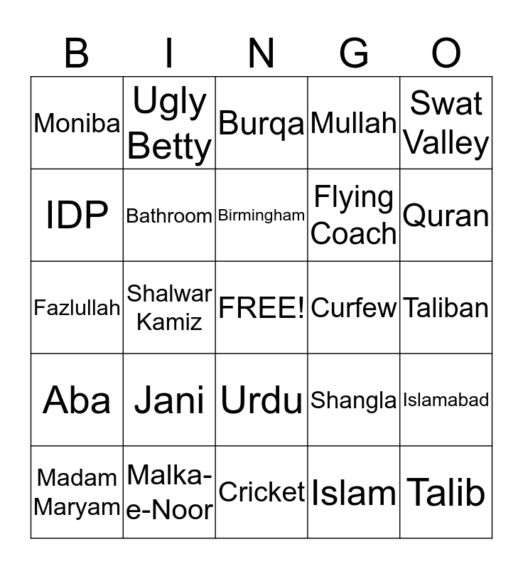 This bingo card has a free space and 31 words: Cricket, Khushal, Shalwar Kamiz, Gul Makai, Moniba, Burqa, Bathroom, Shangla, Curfew, Islam, Taliban, Talib, Terrorism, Interview, Quran, Pakistan, Islamabad, Jani, Aba, Urdu, Swat Valley, Atal, Madam Maryam, Ugly Betty, Flying Coach, IDP, Mullah, Fazlullah, Malka-e-Noor, Birmingham and Green.